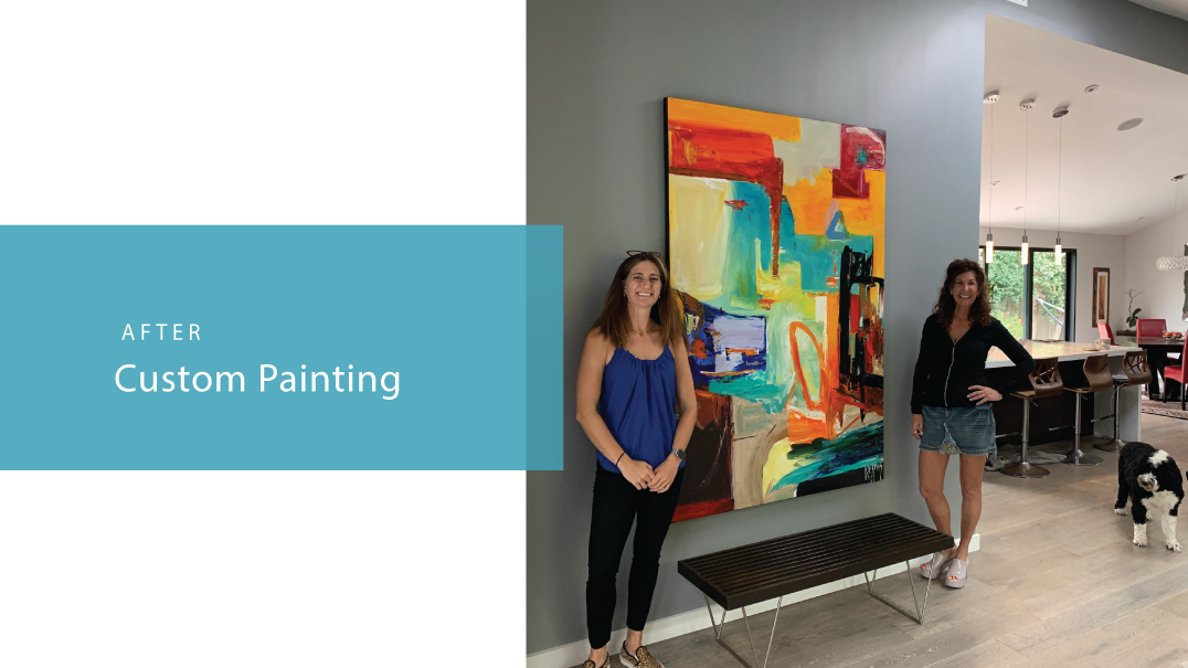 Since the homeowner did not love any of the new choices, the artist decided to paint an entire new painting that had the same tones and feel as the original painting + a sprinkle of symbolic details of the home owner’s personal life philosophy. This custom painting for interior design solution quickly became a leading focal point completing the newly renovated space.