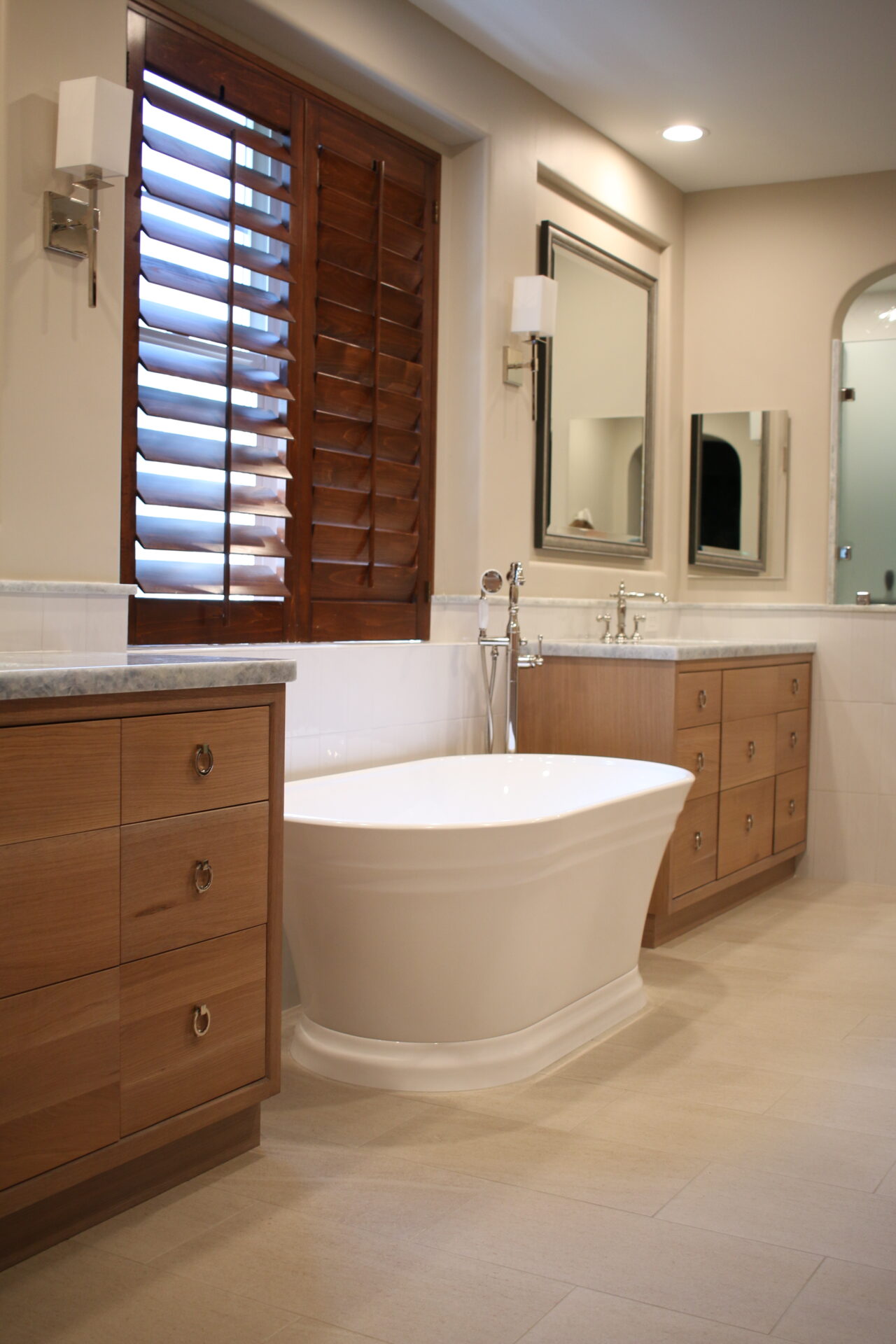 - We did not move the plumbing around much in this one but freestanding soaking tub give you more visual space and ties the vanities together with them touching the bathroom is spacious neutral and elegant.